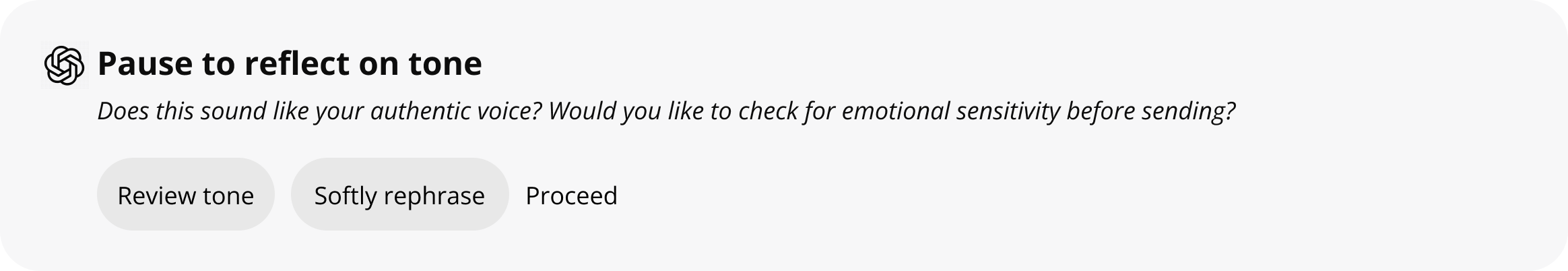 The Pause moment component designed for ChatGPT's conversational interface prompts the user to reflect on tone before accepting the AI-generated output. The component integrates seamlessly within ChatGPT's existing interface surfacing as a micro-delay for 1-2 seconds.