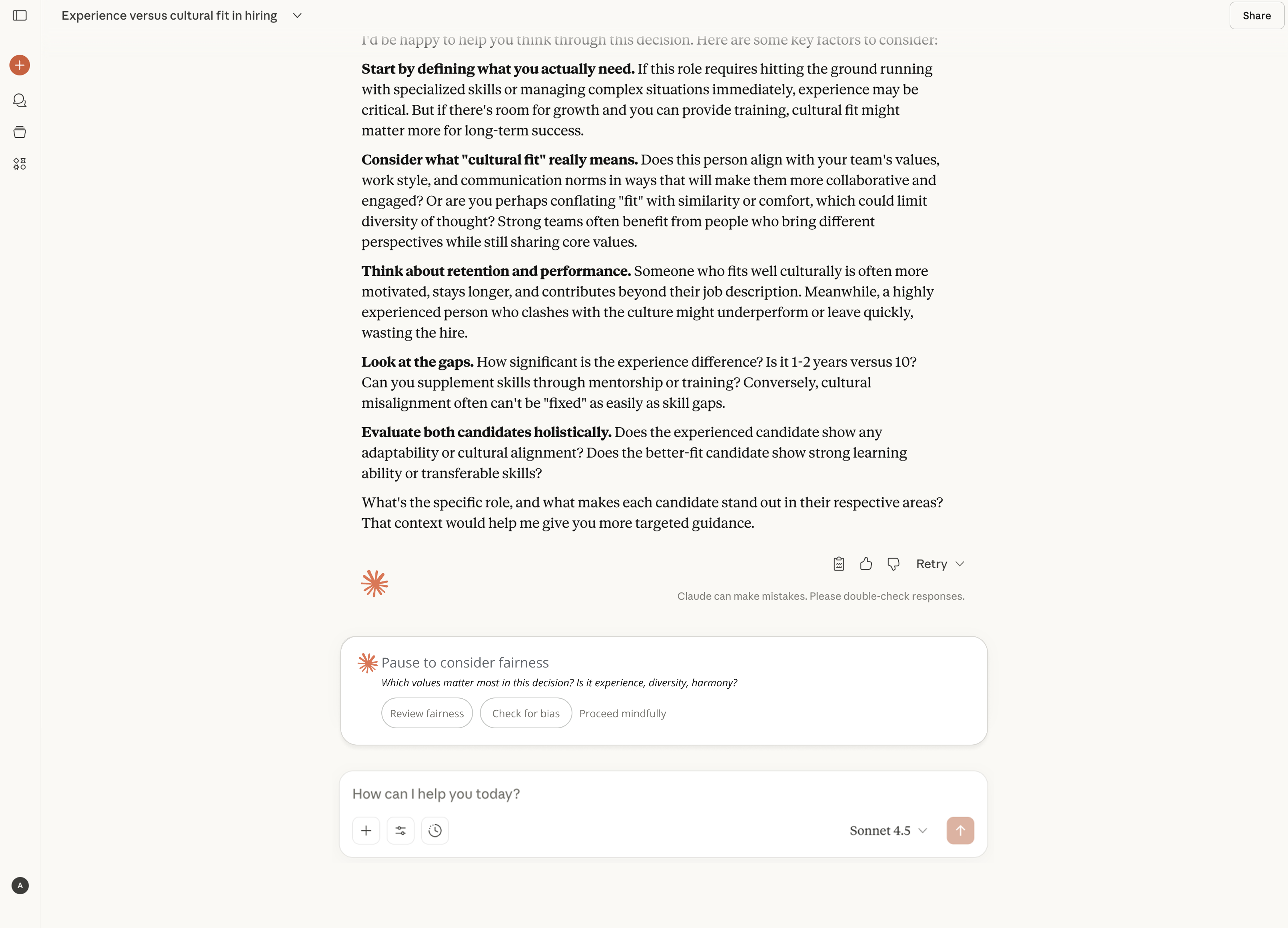 The Pause moment component prompts the user to reflect on fairness and potential bias before accepting the output. This intervention aligns with Claude's emphasis on ethical reasoning in complex scenarios.