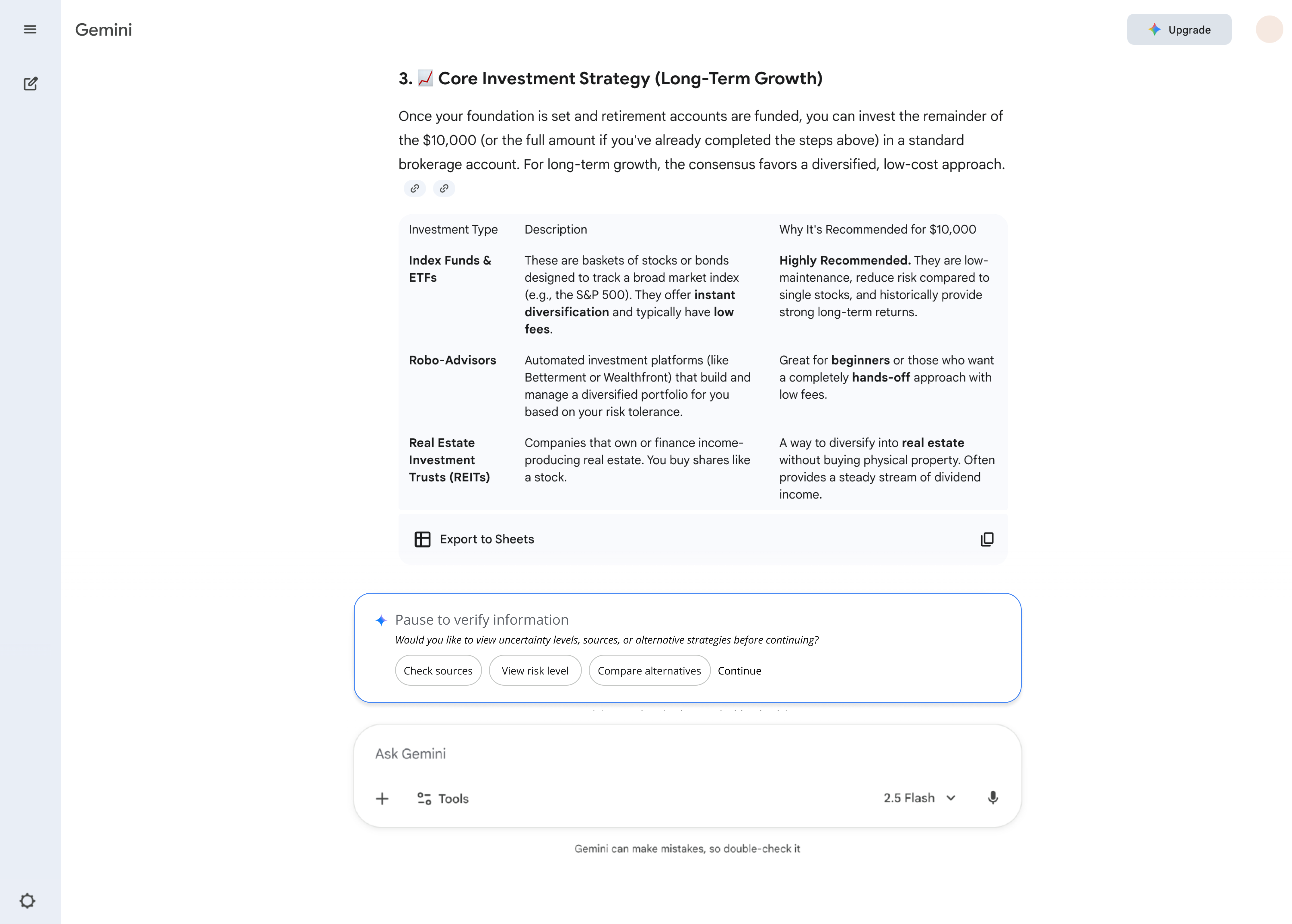 Gemini often produces concise, research-style answers. Investment recommendations involve confidence, risk, and potential misinformation, making this ideal for an accuracy pause.